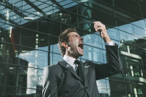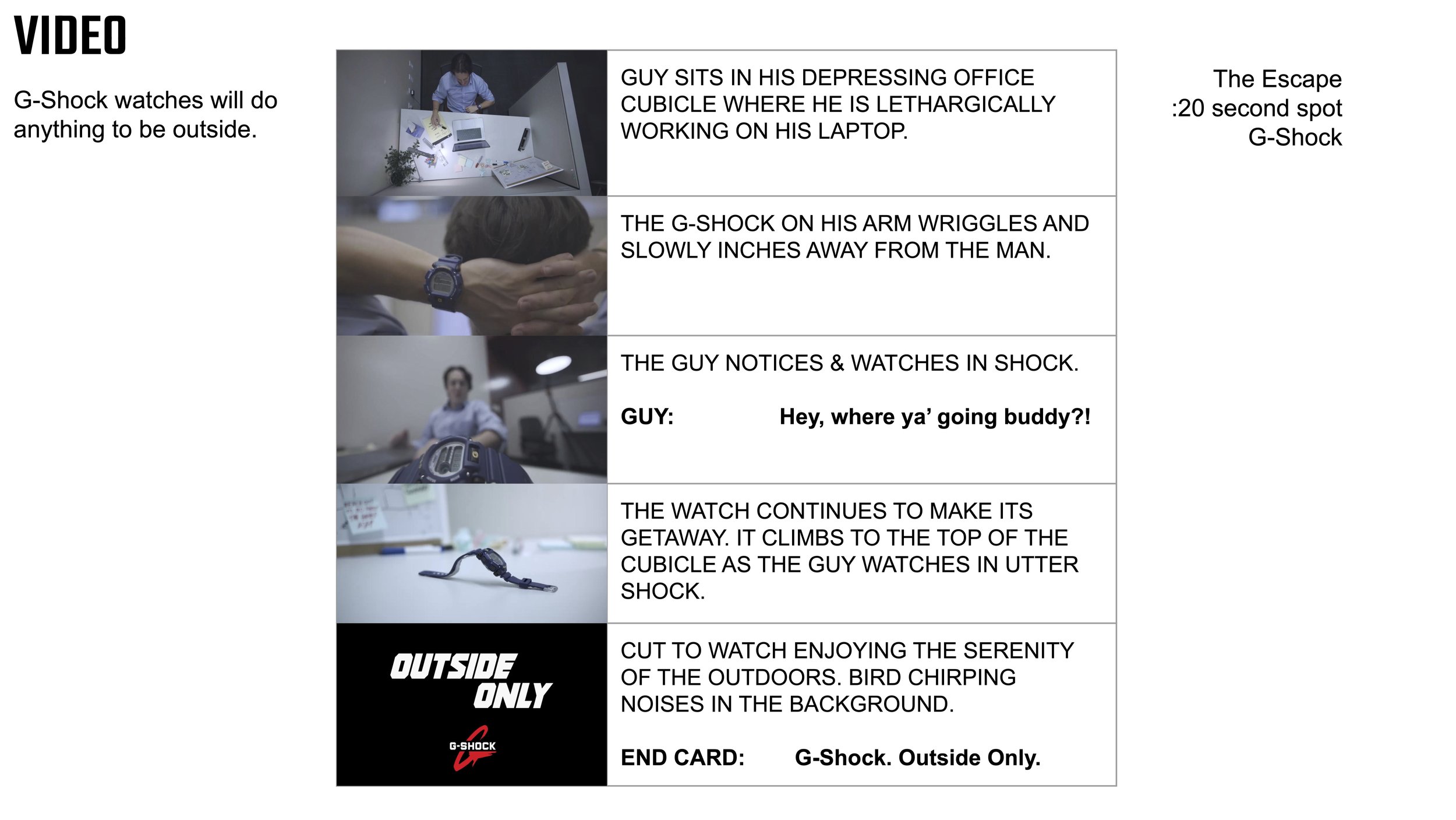 In the middle of SF’s financial district a businessman (actor) wearing a G-Shock runs out of an office building and on to the crowded street acting as if his G-Shock is controlling him.
