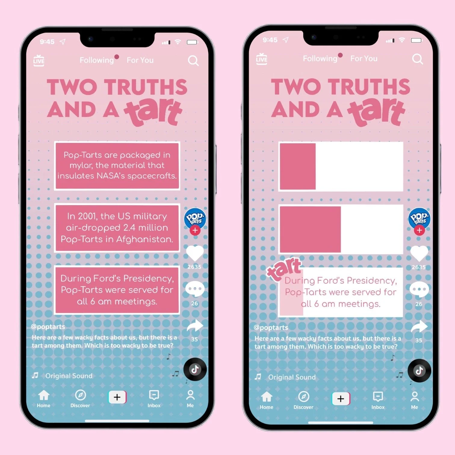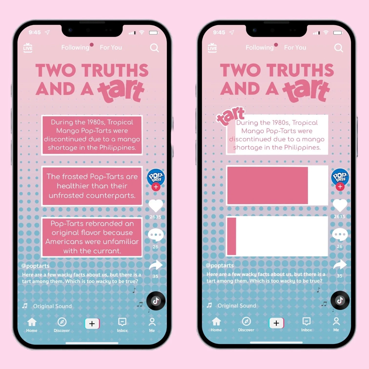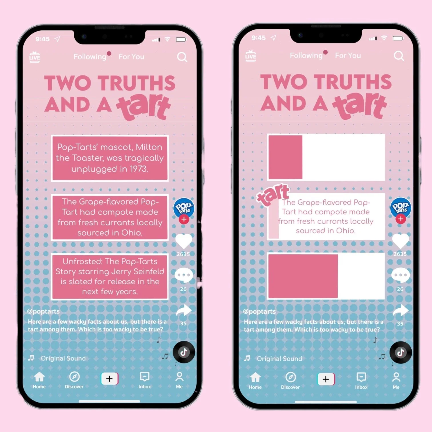 In this TikTok ad, users are presented with an interactive Two Truths & A Tart game (consisting of three rounds of questions).